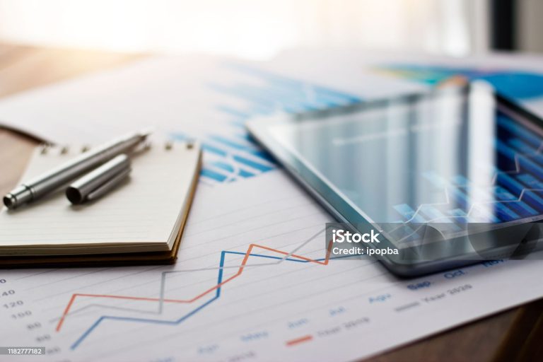 Business document report on paper and tablet with sales data and financial business growth graph on table background.
