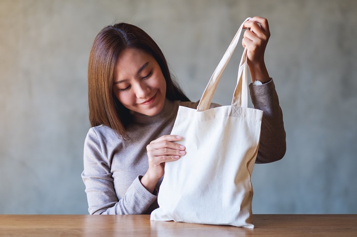 Closeup image of a beautiful young asian woman holding and carrying a white fabric tote bag for reusable and environment concept